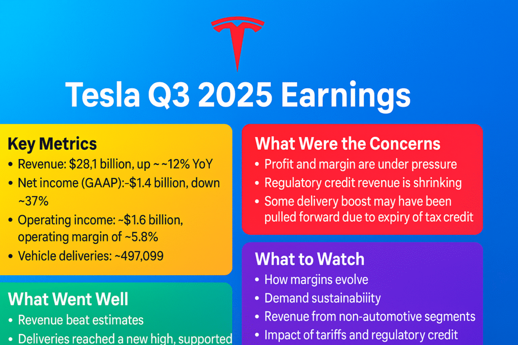 As a 2 lines summary — Tesla’s Q3 2025 earnings showed strong revenue growth but a significant drop in profits due to higher costs and price cuts. Investors remain cautious, while Elon Musk remains confident in Tesla’s long-term vision focused on AI and self-driving technology.